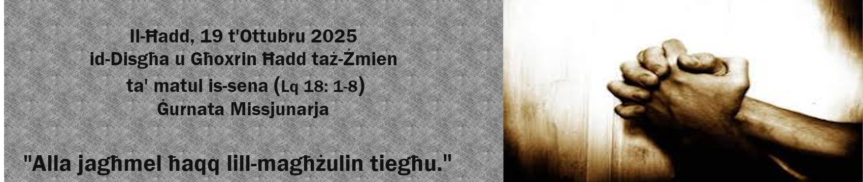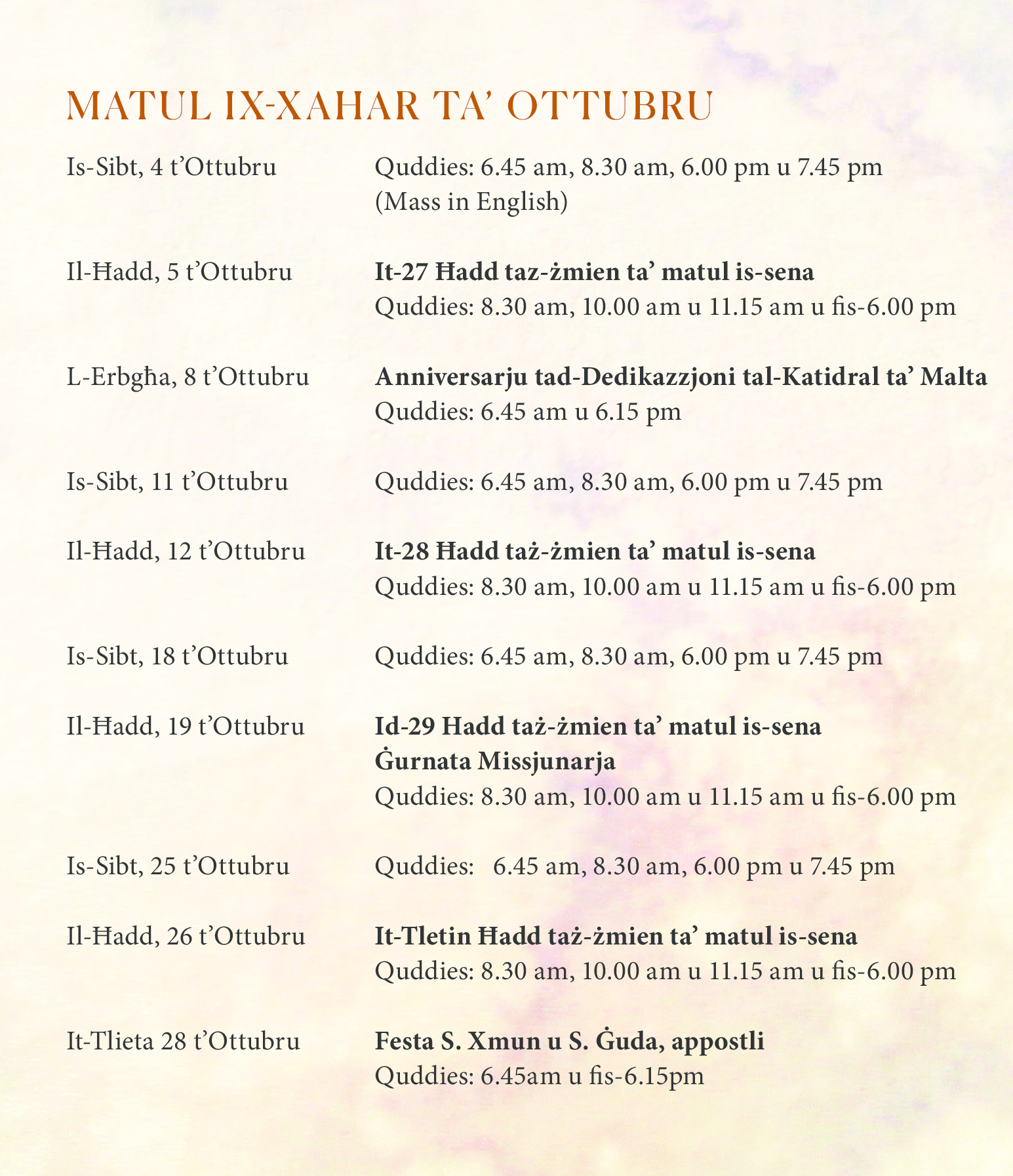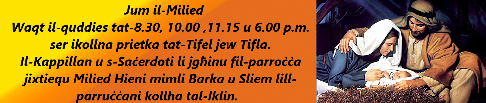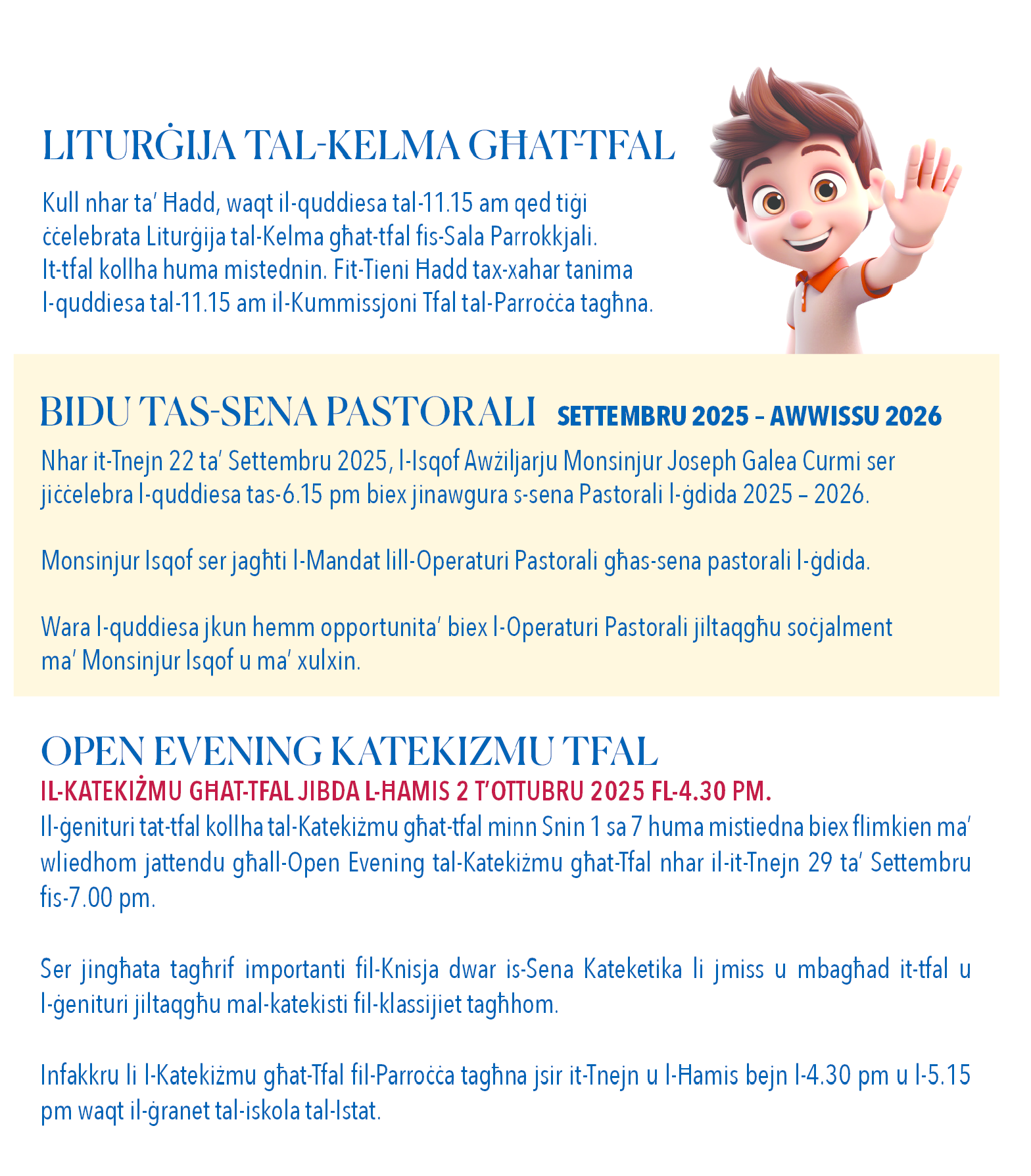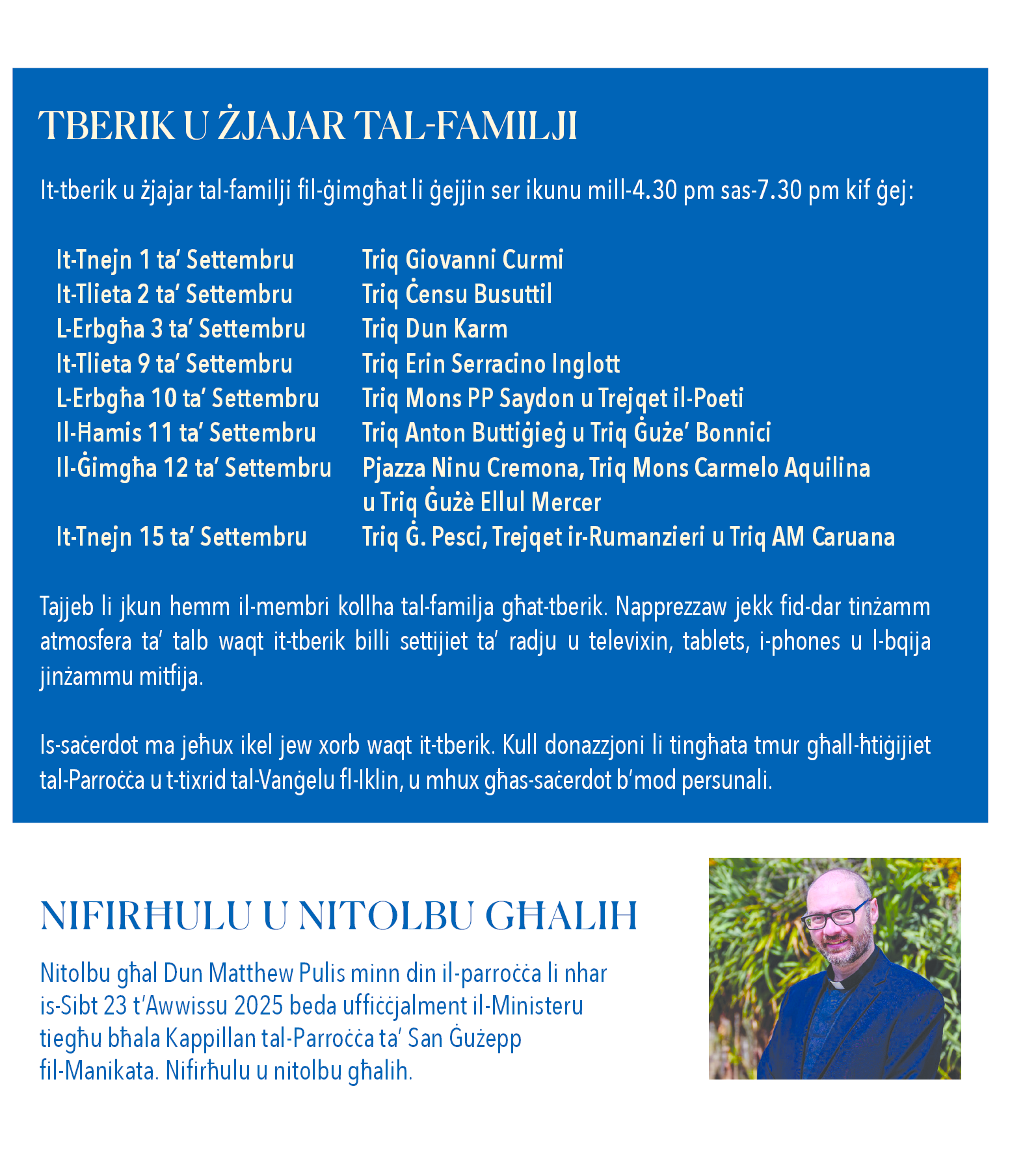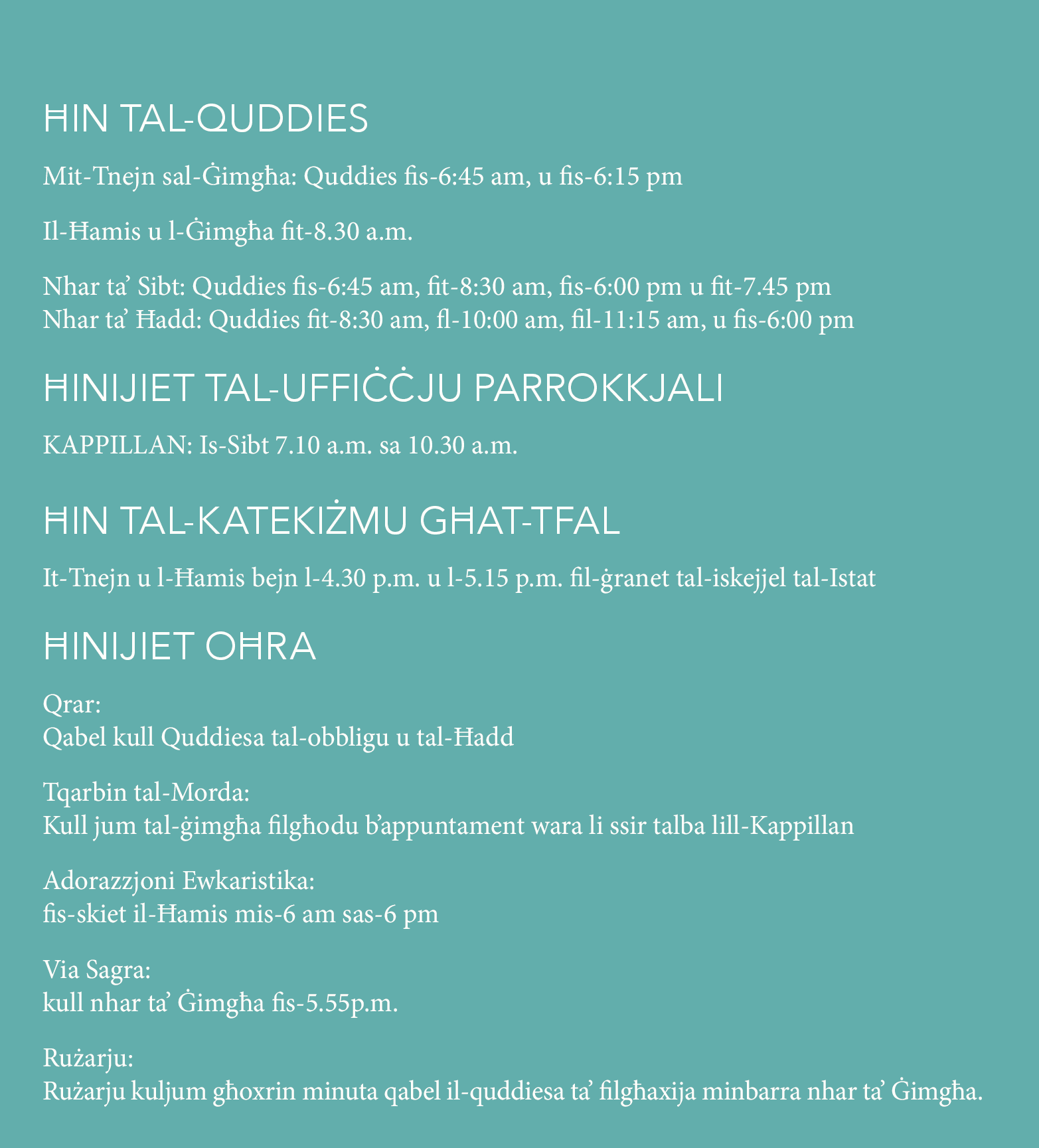 Ħin tal-Uffiċċju Parrokkjali: s-Sibt 7.10 a.m. sa 10.30 a.m.