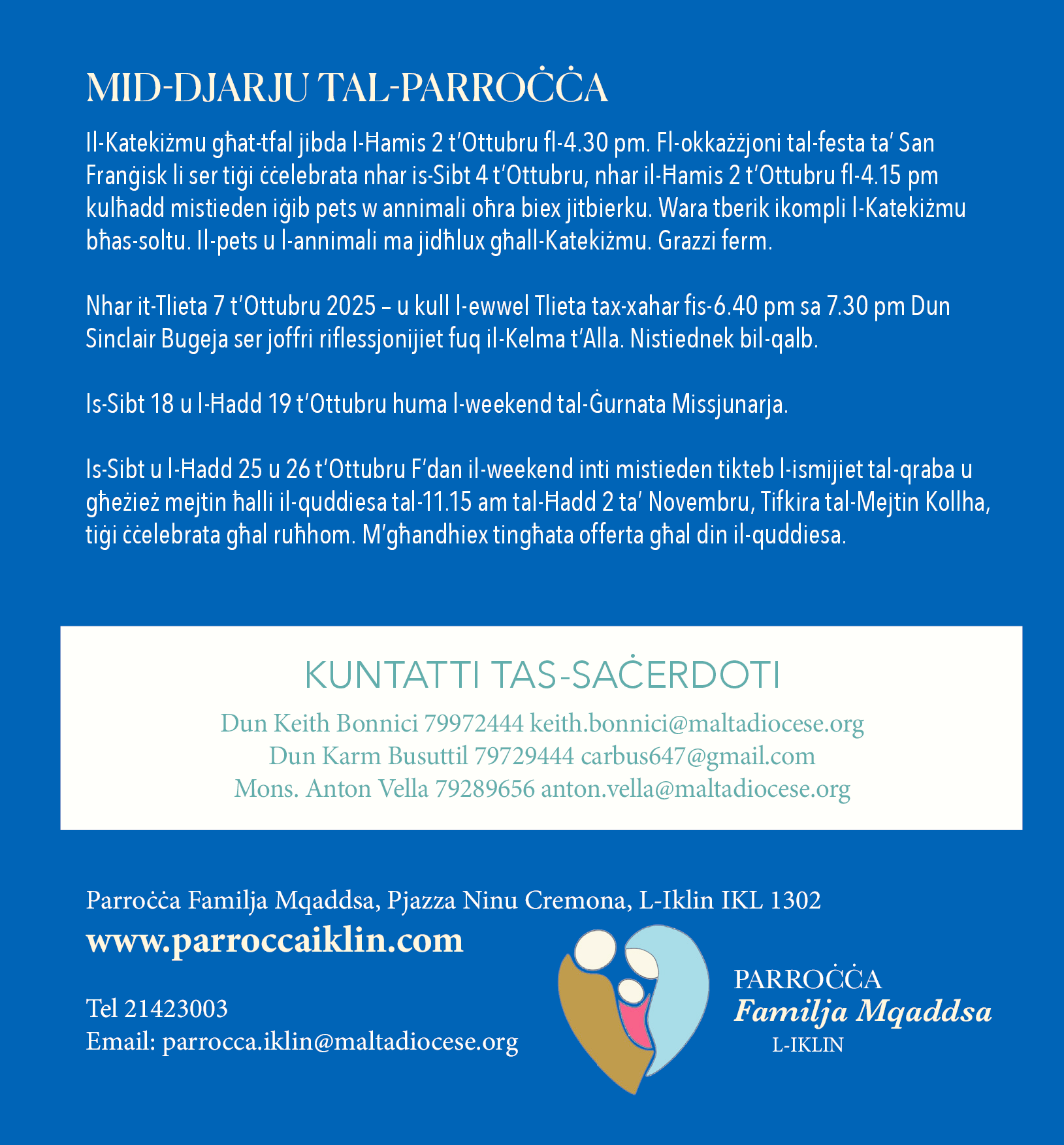 Parroċċa Familja Mqaddsa, Pjazza Ninu Cremona, L-Iklin IKL 1302 www.parroccaiklin.com