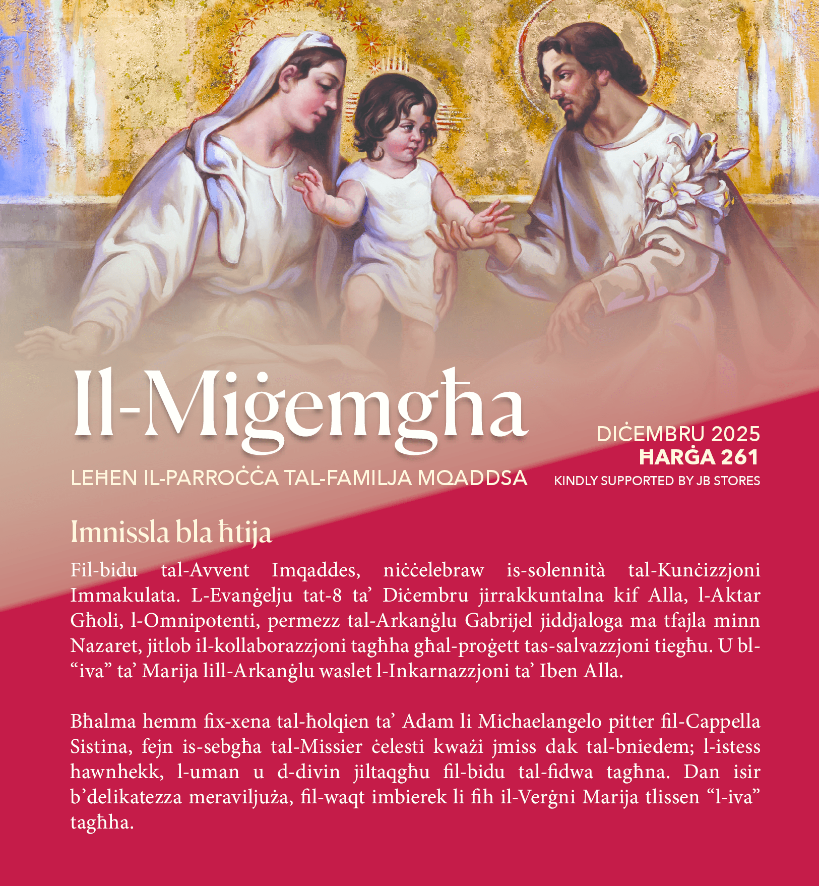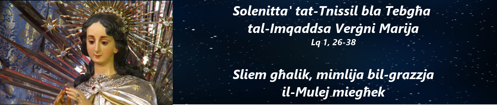 L-Evanġelju tat- 8 ta’ Diċembru jirrakkuntalna kif Alla, l-Aktar Għoli, l-Omnipotenti, permezz tal-Arkanġlu Gabrijel jiddjaloga ma tfajla minn Nazaret, jitlob il-kollaborazzjoni tagħha għal-proġett tas-salvazzjoni tiegħu. U bl- “iva” ta’ Marija lill-Arkanġlu waslet l-Inkarnazzjoni ta’ Iben Alla.