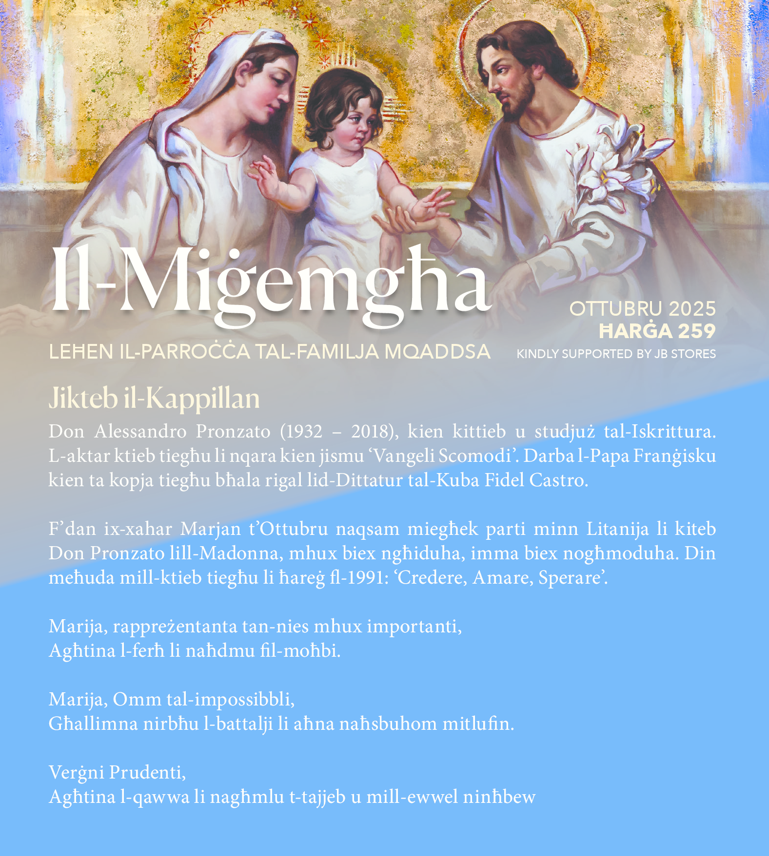 F’dan ix-xahar Marjan t’Ottubru naqsam miegħek parti minn Litanija li kiteb Don Pronzato lill-Madonna, mhux biex ngħiduha, imma biex nogħmoduha. Din meħuda mill-ktieb tiegħu li ħareġ fl-1991: ‘Credere, Amare, Sperare’.