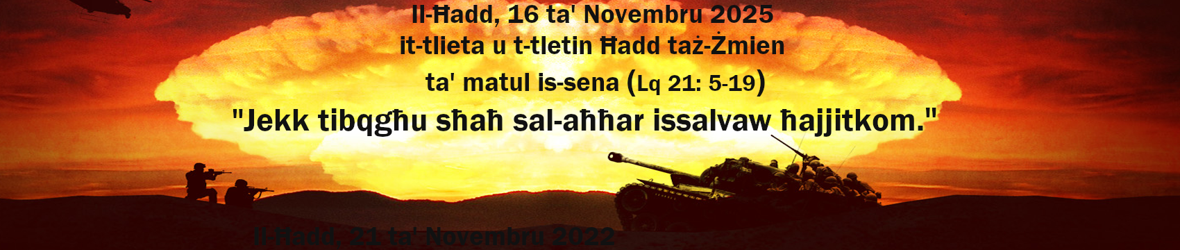 - Sew jekk tieklu, sew jekk tixorbu, tagħmlu x’tagħmlu, agħmlu kollox għall-glorja ta’ Alla 1Kor:10:31