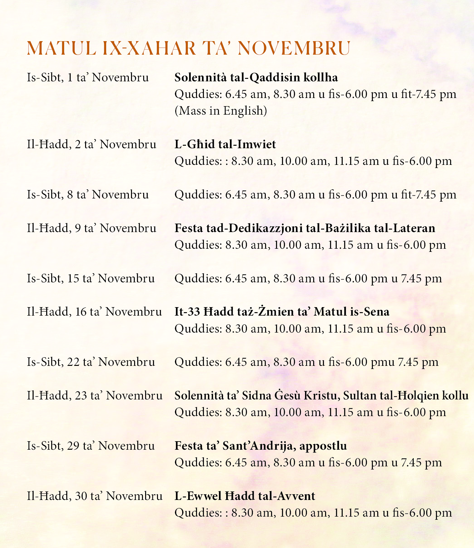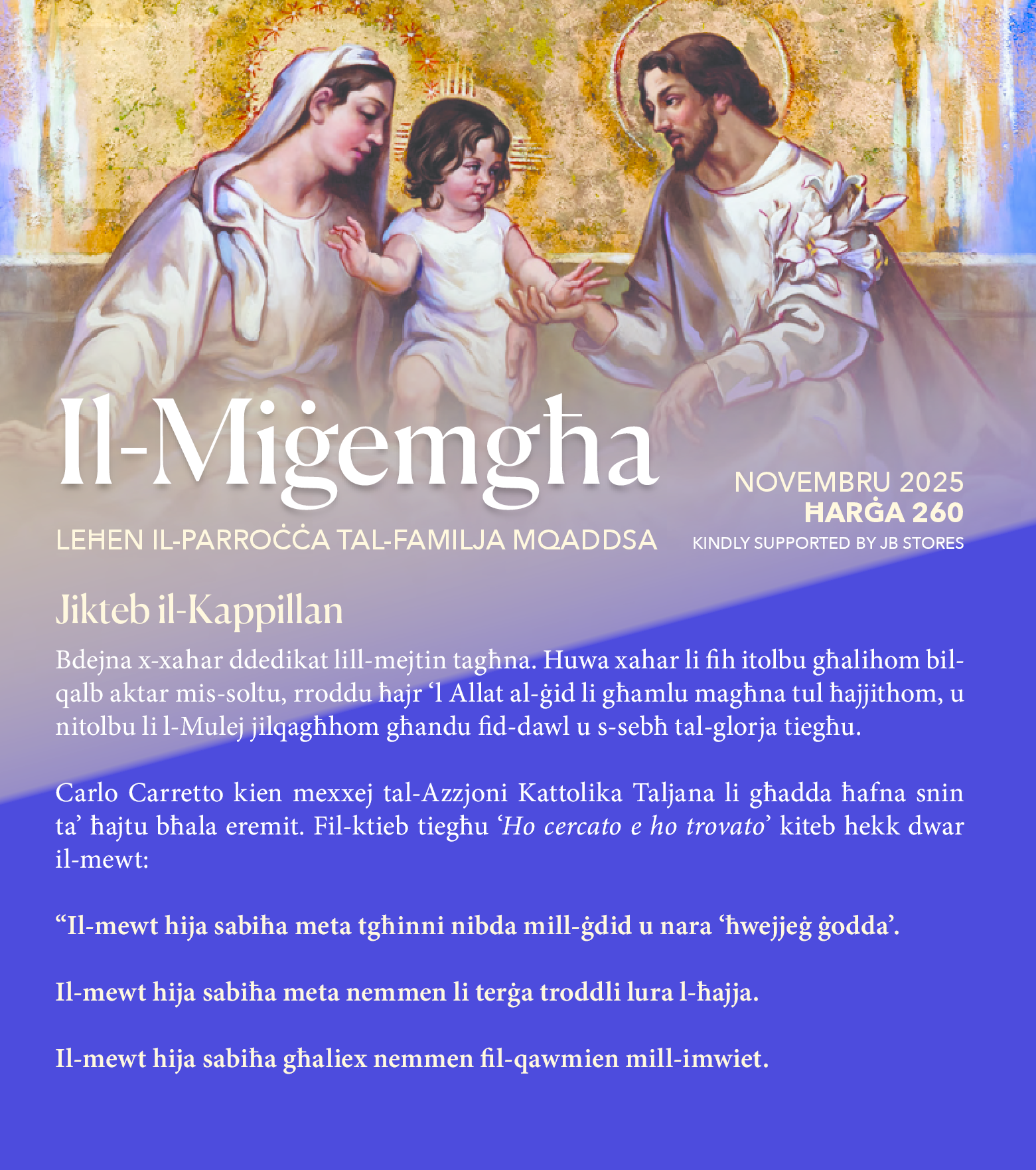 Bdejna x-xahar ddedikat lill-mejtin tagħna. Huwa xahar li fih itolbu għalihom bil-qalb aktar mis-soltu, rroddu ħajr ‘l Allat al-ġid li għamlu magħna tul ħajjithom, u nitolbu li l-Mulej jilqagħhom għandu fid-dawl u s-sebħ tal-glorja tiegħu.