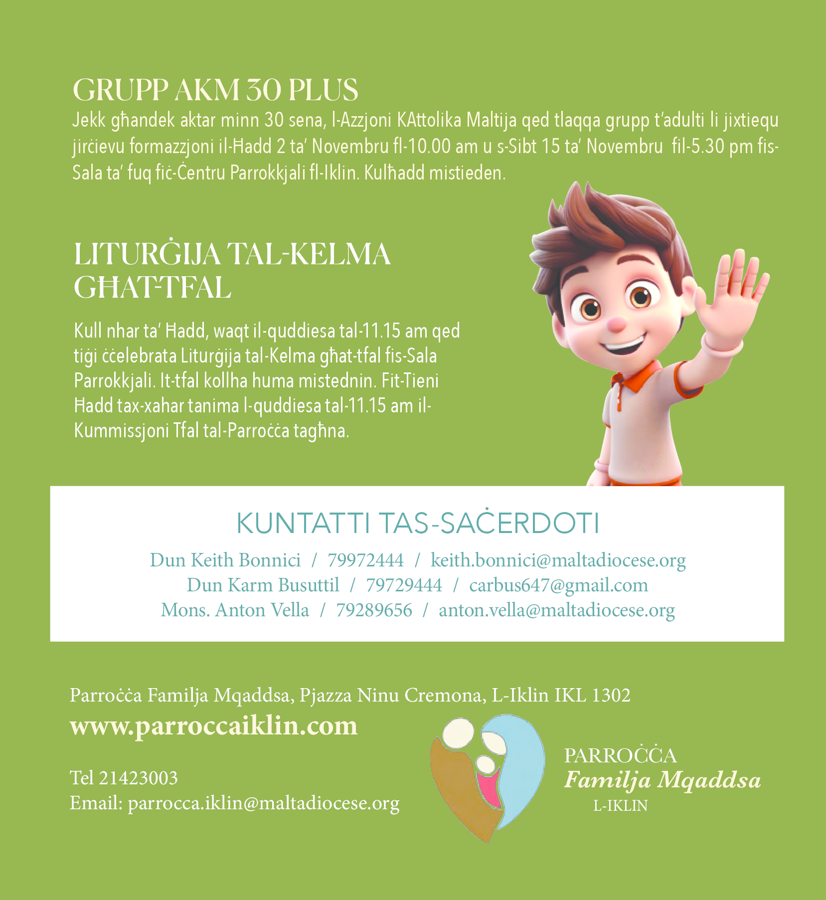 Parroċċa Familja Mqaddsa, Pjazza Ninu Cremona, L-Iklin IKL 1302 www.parroccaiklin.com