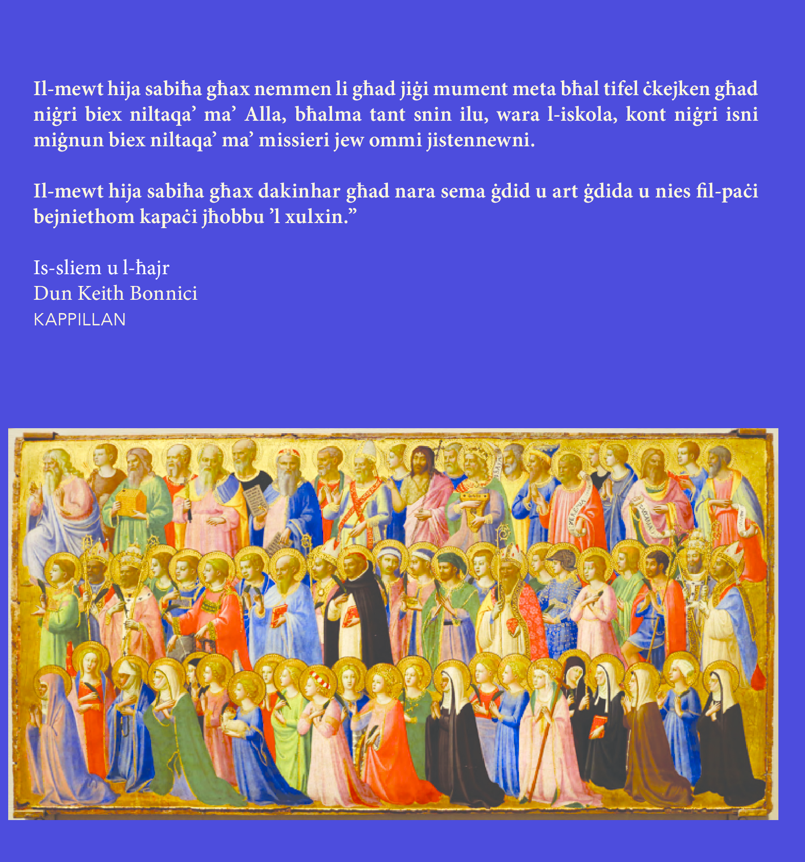 Il-mewt hija sabiħa għax dakinhar għad nara sema ġdid w art ġdida u nies fil-paċi bejniethom kapaċi jħobbu ‘l xulxin.”