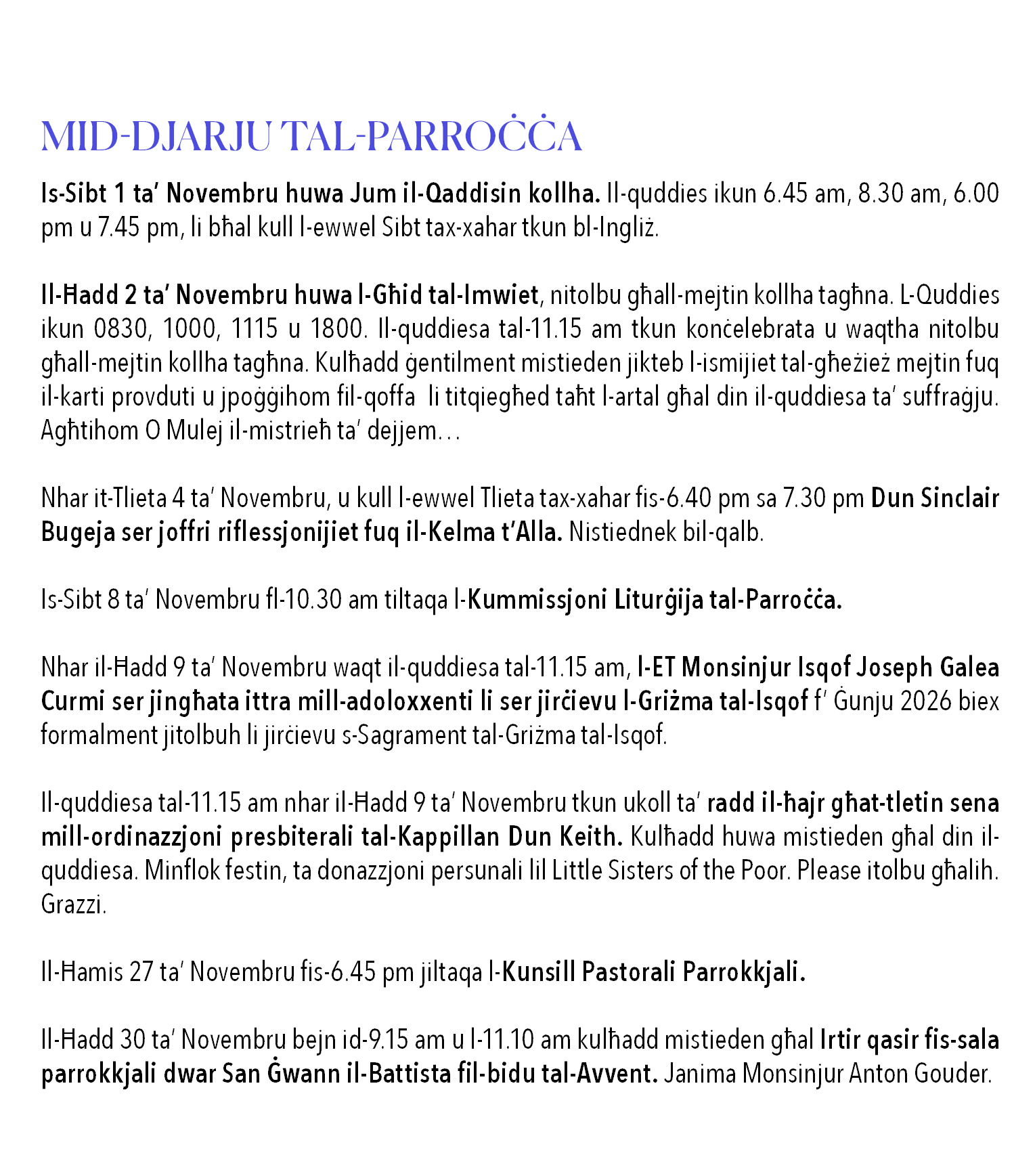 TQARBIN TAL-MORDA: Kuljum tal-ġimgħa filgħodu b’appuntament wara li ssir talba lill-Kappillan.