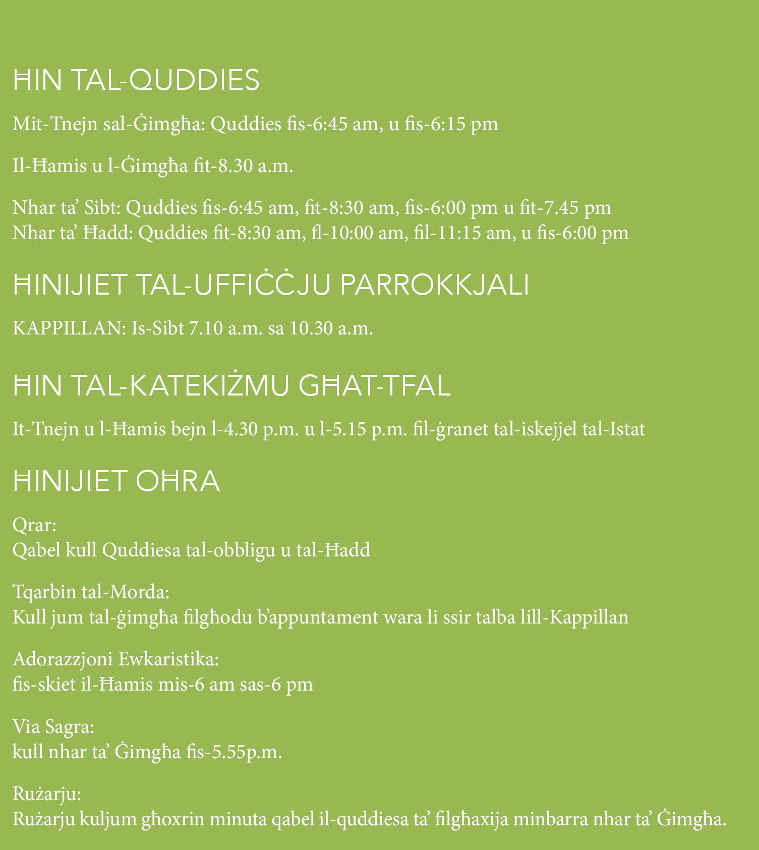 Ħin tal-Uffiċċju Parrokkjali: s-Sibt 7.10 a.m. sa 10.30 a.m.